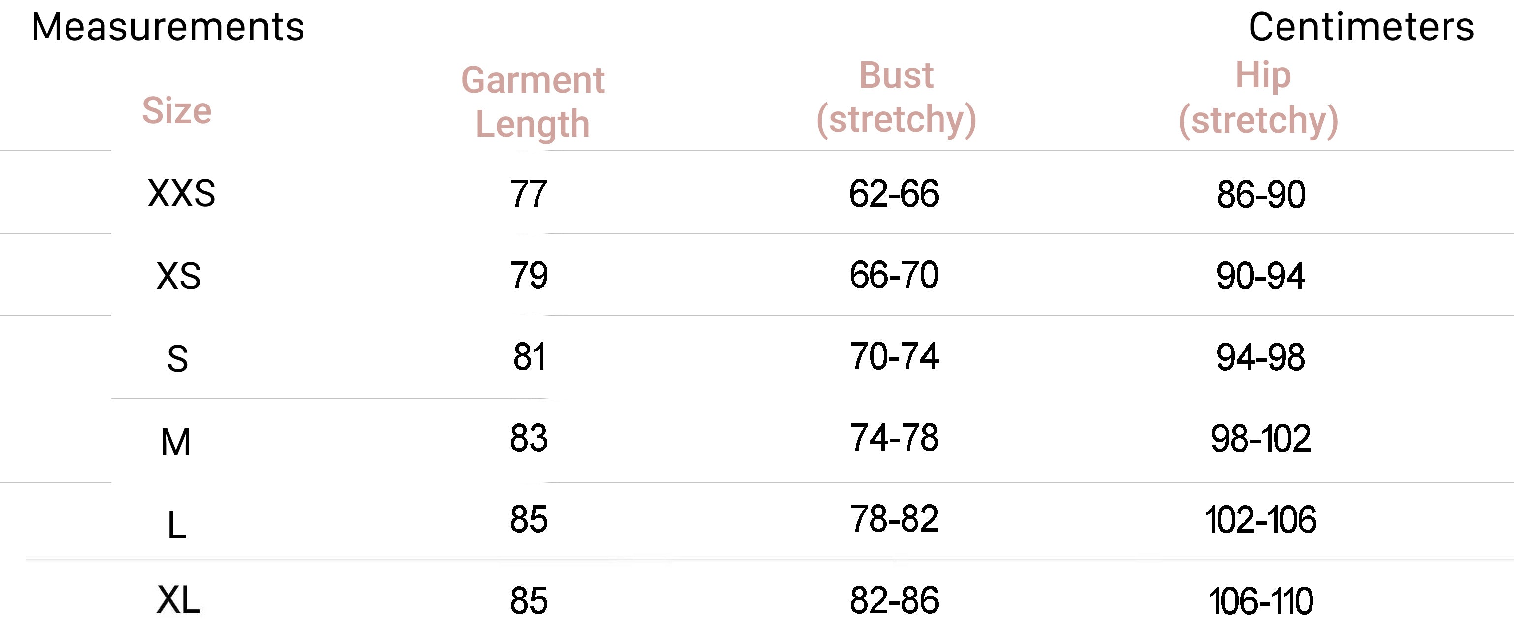 | Size | US | EUR | UK | Bust | Waist | Hip |