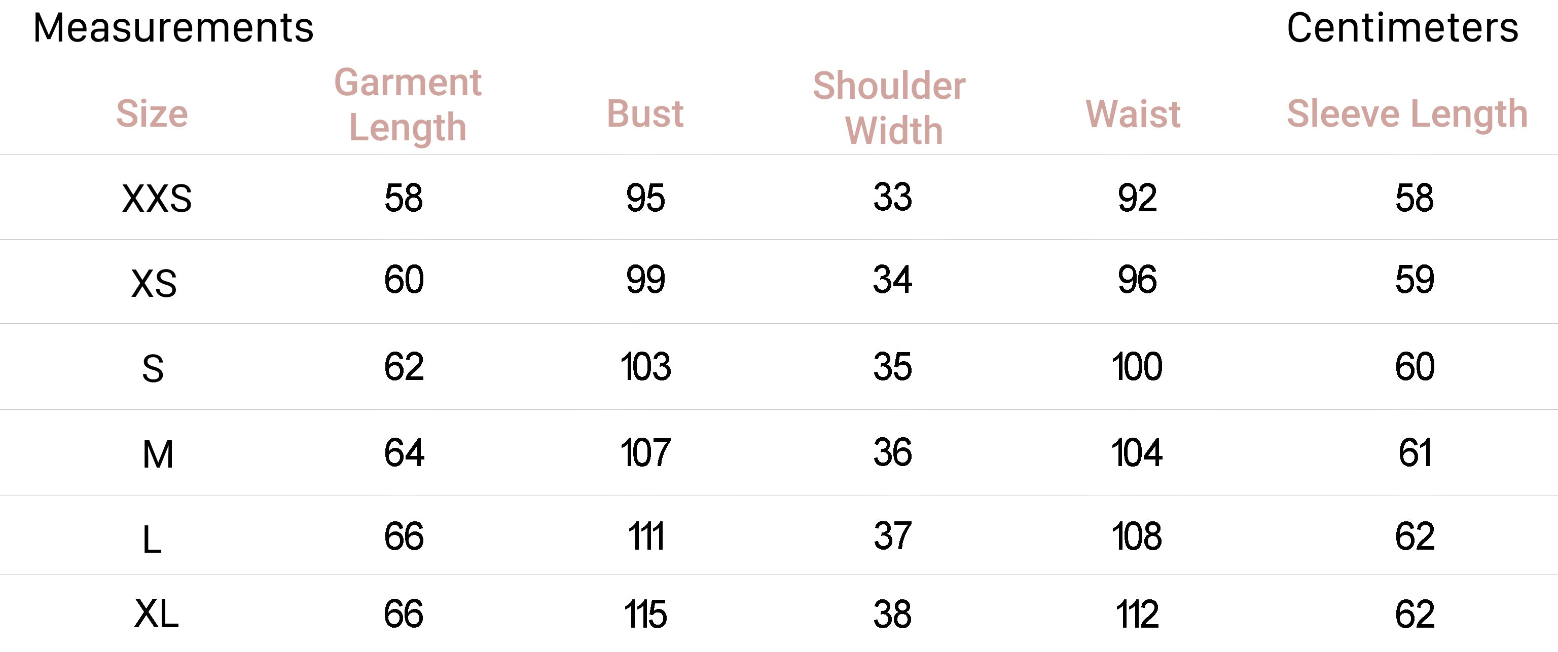 | XXS | 0 | 32 | 4 | 29.5-31 | 22-24 | 32.5-34 |