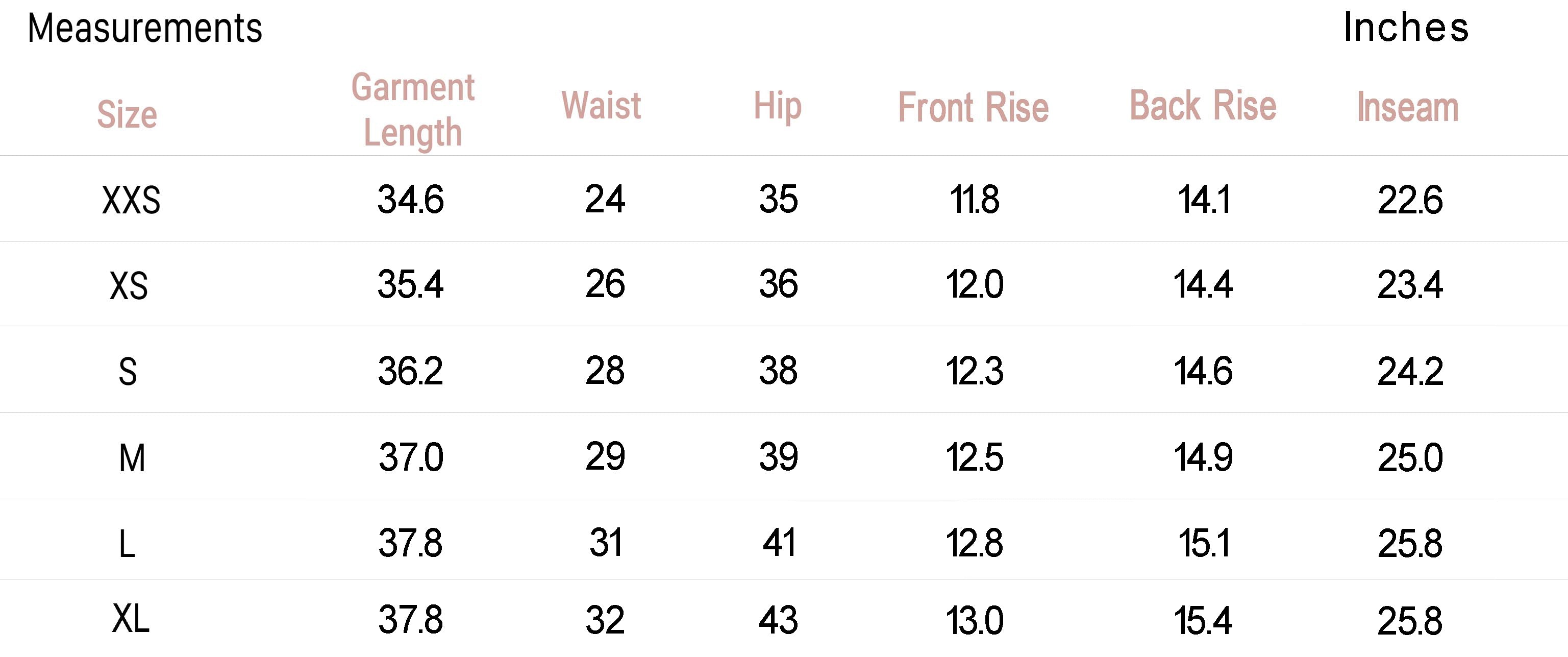 - Size XS - Inseam: 23.4", Rise: 14.4"