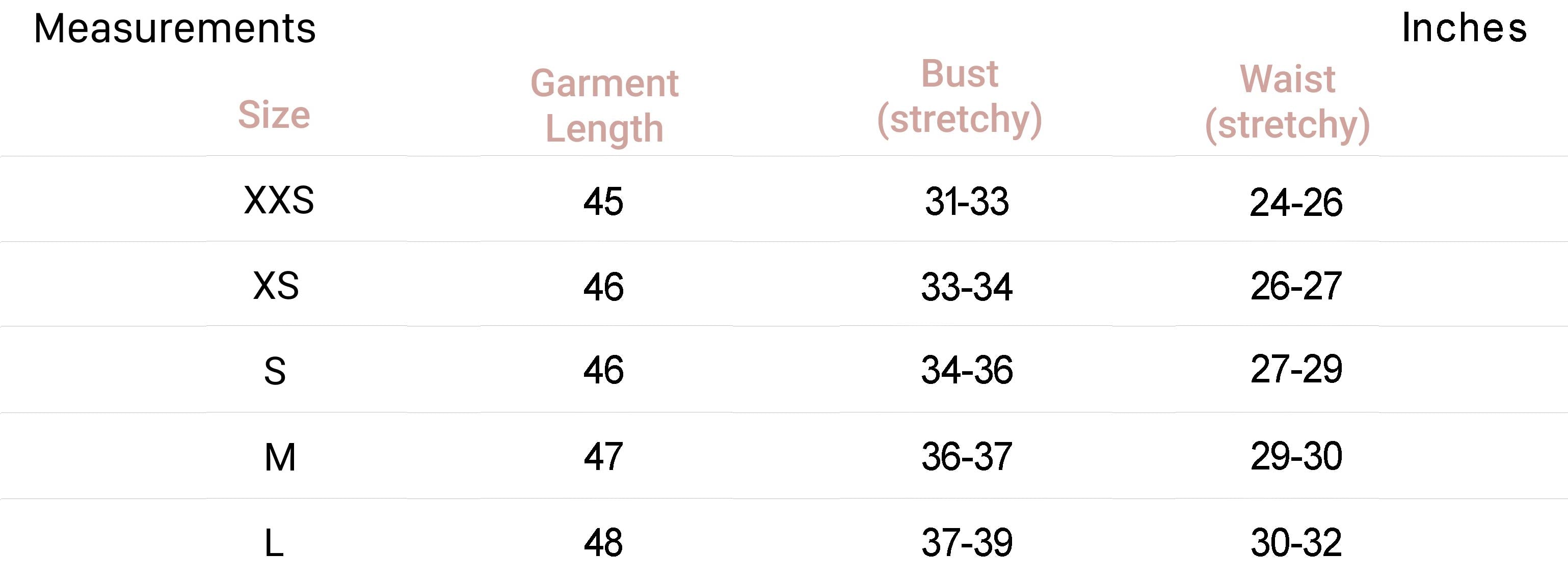 | XXS | 0 | 32 | 4 | 29.5-31 | 22-24 | 32.5-34 |