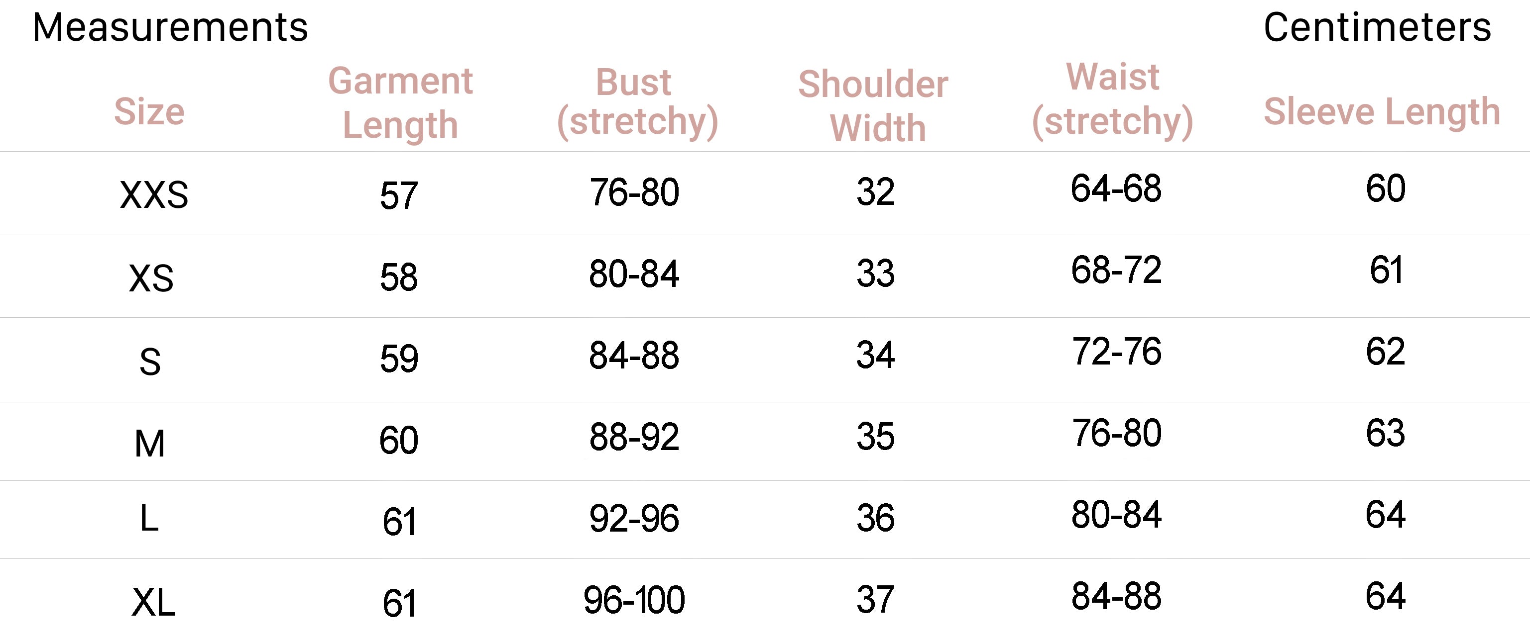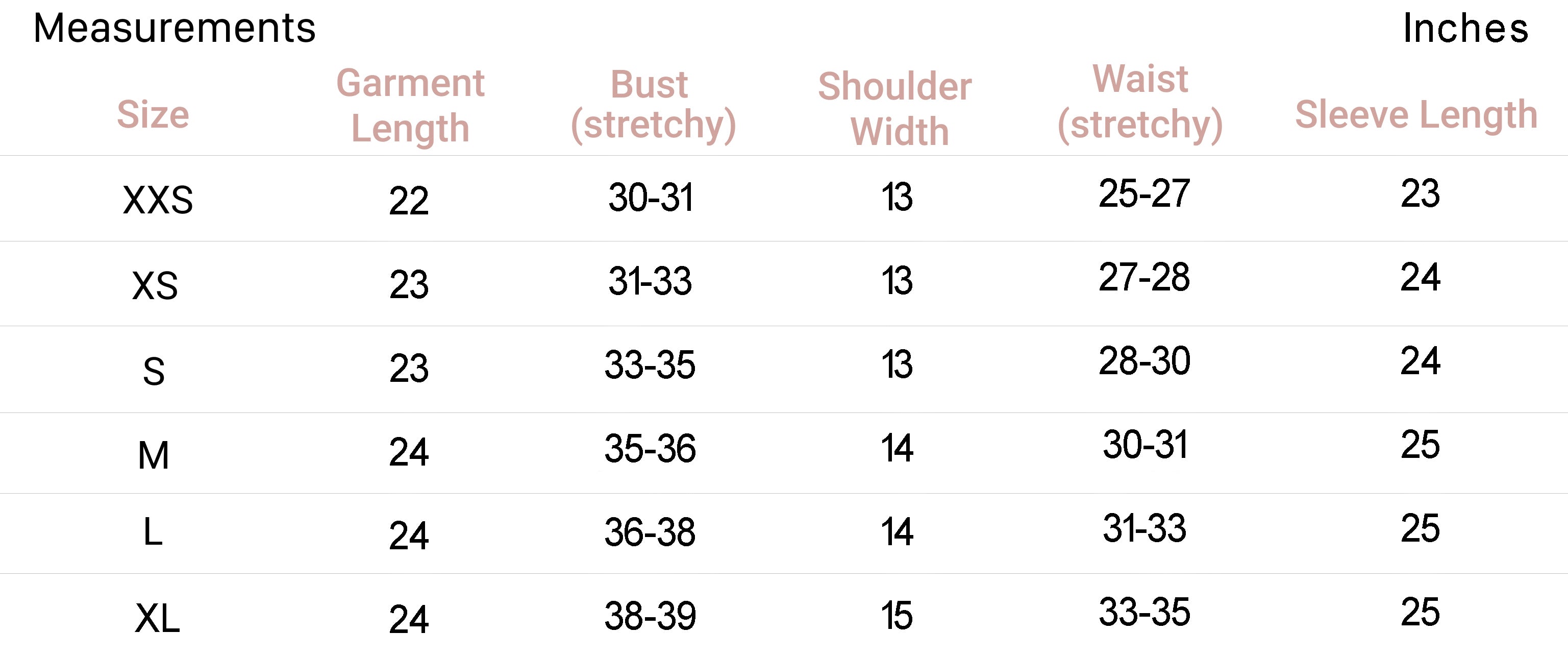 XS 2 34 6 31-32.5 25-26 34-35.5