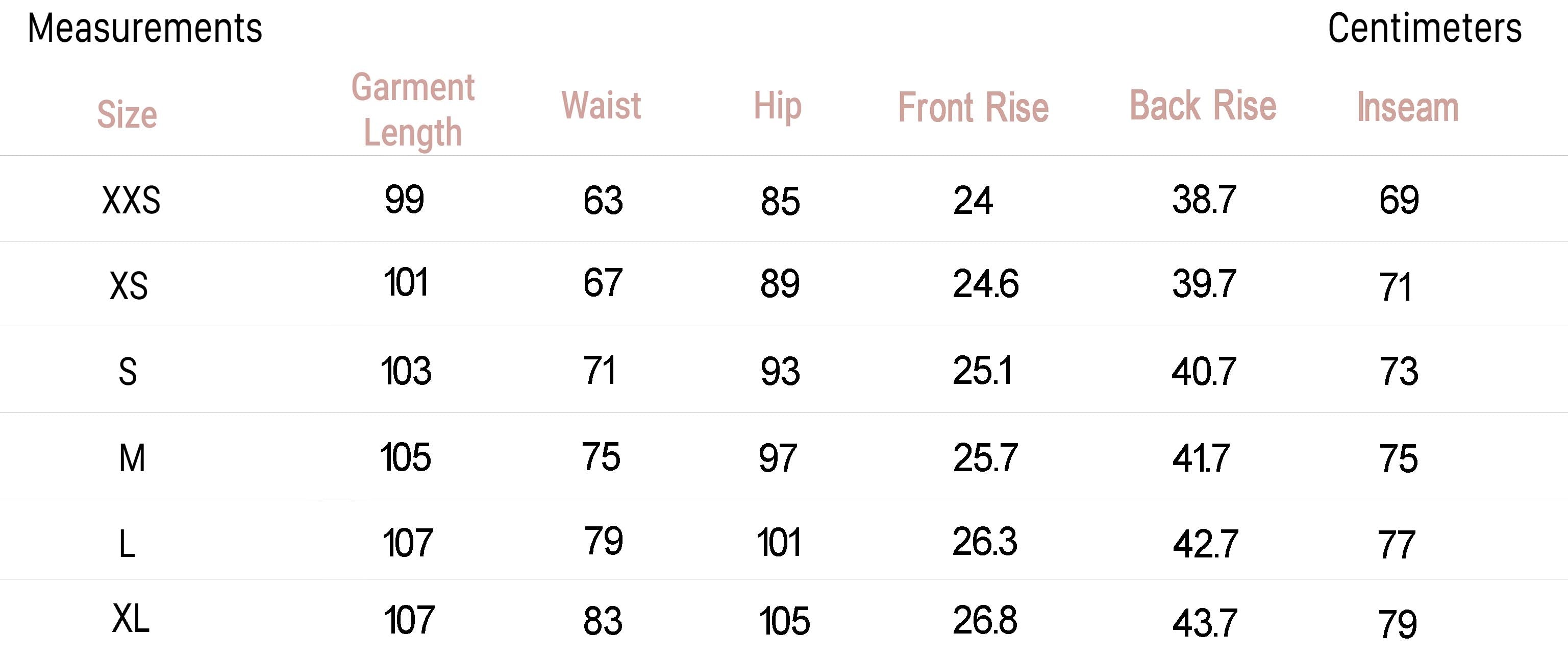 • Size XXS - Inseam: 27.2", Rise: 9.4"